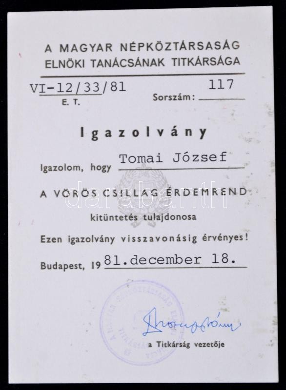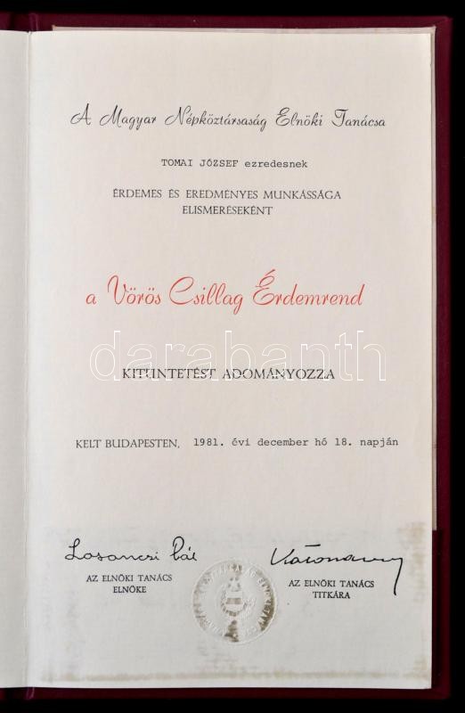 1981 Vörös Csillag Érdemrend kitüntetés adományozó oklevél Tomai Józse... https://www.darabanth.com/de/30-Gross-Auktion/30.1/Andere-Sammelgebiete/Dokument~12209/1981-Voros-Csillag-Erdemrend-kituntetes-adomanyozo-oklevel-Tomai-Jozsef-1922-2016-ezredes~II1862042