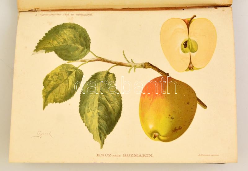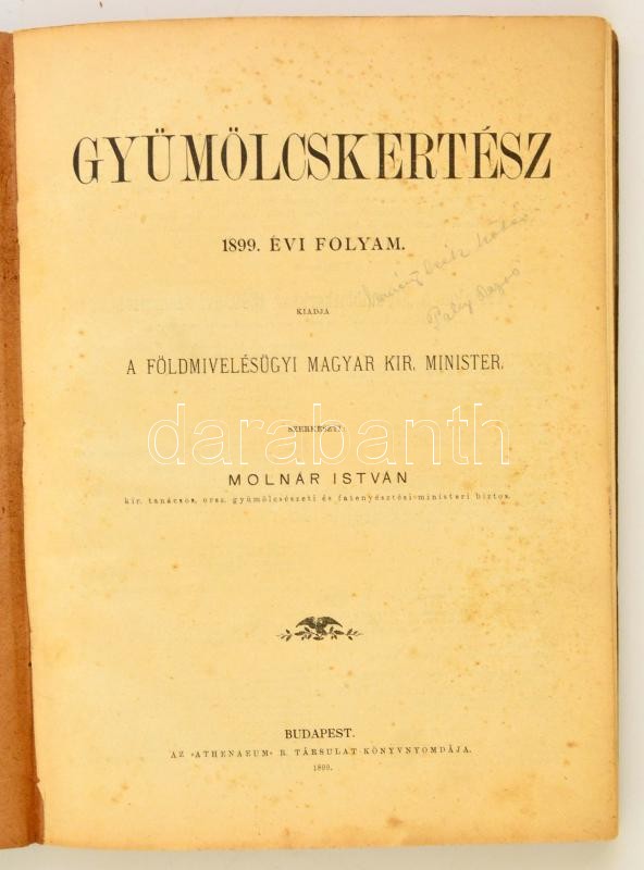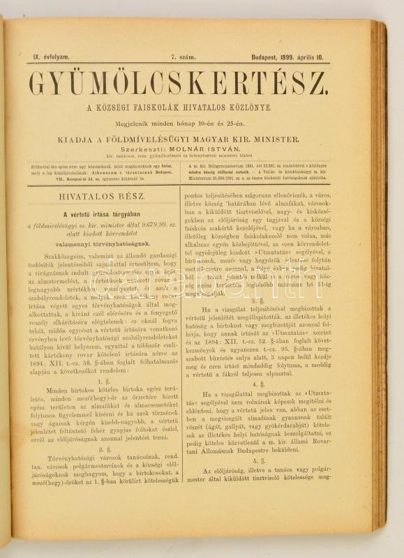 1899 Gyümölcskertész. IX. évf. 1-24. szám. Teljes évfolyam. Szerk.: Rudinai Molnár István. Bp.,1899, Athenaeum, VIII+1 t. (Színes műmelléklet, litográfia)+284 p. Szövegközti és egészoldalas képekkel illusztrálva. Korabeli átkötött félvászon-kötés, 115/116. lap javított.