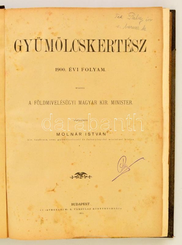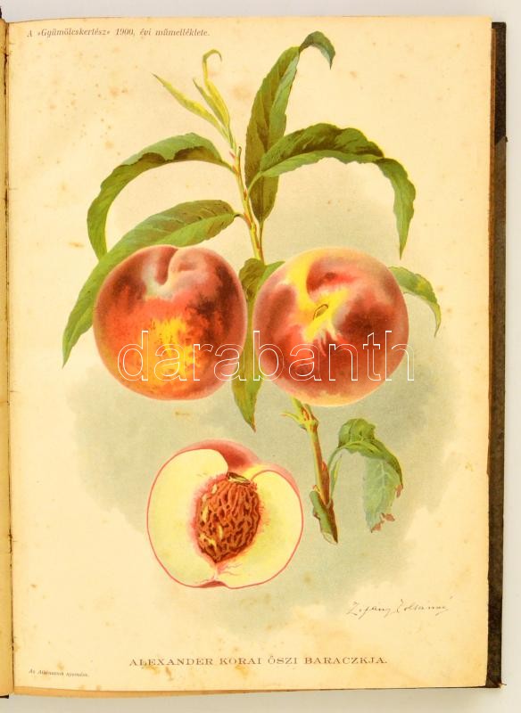1900 Gyümölcskertész. X. évf. 1-24. szám. Teljes évfolyam. Szerk.: Rudinai Molnár István. Bp.,1900, Athenaeum, 1 t. (Színes műmelléklet, litográfia)+X+278 p. Szövegközti és egészoldalas képekkel illusztrálva. Korabeli átkötött félvászon-kötés, kissé foltos lapokkal, hibás kötéssel, a 23. számot a 278. oldal után kötötték be (253-262.)
