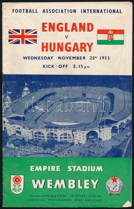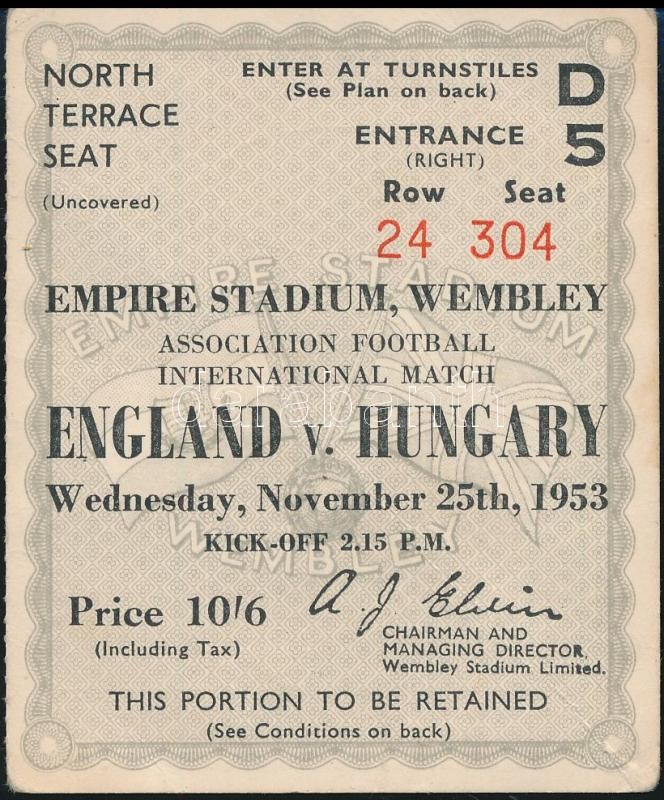 1953 Magyarország-Anglia, a legendás 6:3-as labdarúgó mérkőzés meccsfüzete, és egy belépőjegy a Wembley Stadionba, ahol az Aranycsapat legyőzte az évtizedek óta veretlen Angliát. A füzeten hajtásnyom.