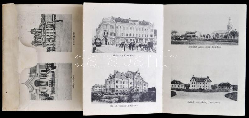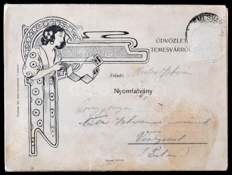 cca 1910 Üdvözlet Temesvárról. 9 lapos, fekete-fehér fotókat tartalmazó leporelló Temesvárról. Az elején szecessziós illusztrációval. Temesvár, Polatsek-féle könyvkereskedés, a bélyeg részénél hiánnyal.