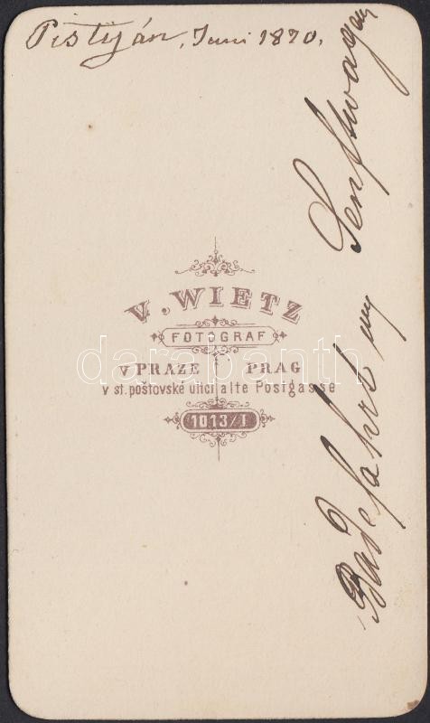Beschreibung: 1870 Pöstyénfürdő (Felvidék), betegszállítás, keményhátú fotó V. Wietz műterméből, hátoldalon feliratozva, 6×10 cm / Kúpele Piešťany, patient transport, vintage photo