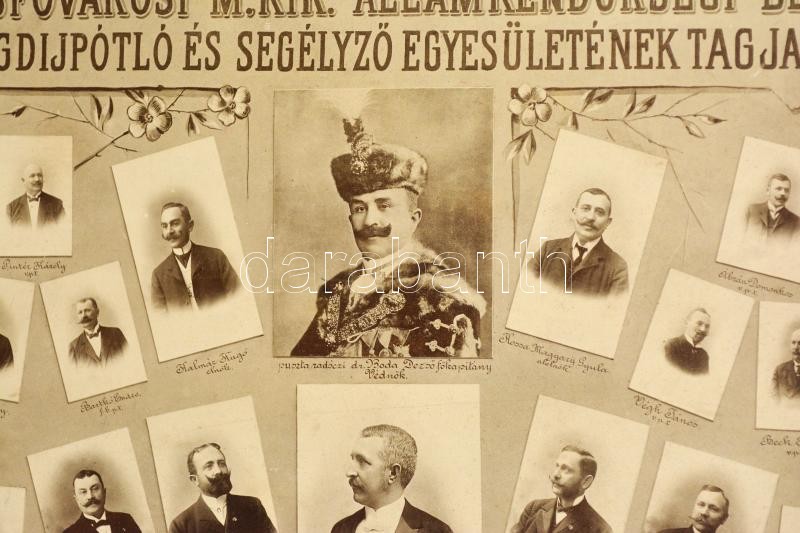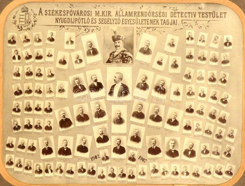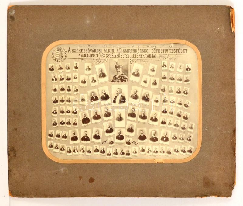 1907 A székesfővárosi m. kir. államrendőrségi detectiv egyesület nyugdíjpótló és segélyező egyesületének tagjai, nagyméretű tablókép, paszpartuban, 48×58 cm