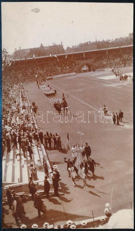 1912 A stockholmi olimpia megnyitóján a résztvevők felvonulása, az előtérben a japán és luxemburgi csapat, fotó, 14×8 cm / The opening ceremony of Olympic Games in Stockholm, photo