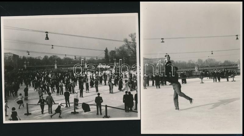 Beschreibung: 1935 Budapest, Rotter Baby és Szollás László műkorcsolya-világbajnok páros korcsolyázik a városligeti pályán, 2 db fotó, 11×8,5 cm