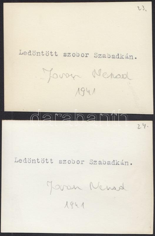 1941 Szabadka, Jovan Nenad ledöntött szobra, 2 db fotó, hátoldalon fel... https://www.darabanth.com/de/30-Gross-Auktion/30.1/Andere-Sammelgebiete/Foto~12613/1941-Szabadka-Jovan-Nenad-ledontott-szobra-2-db-foto-hatoldalon-feliratozva-8-5C3976-cm-Subo~II1862641