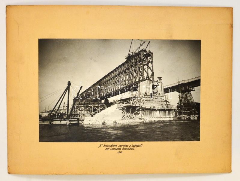 Beschreibung: 1946 Budapest, "K" hídszerkezet szerelése a déli összekötő hídnál, nagyméretű fotó, kartonra ragasztva, feliratozva, 25×39 cm