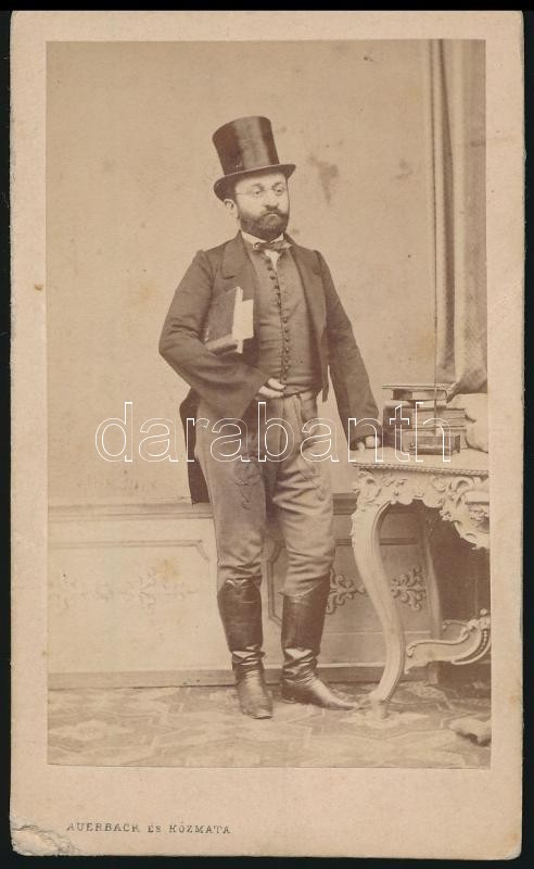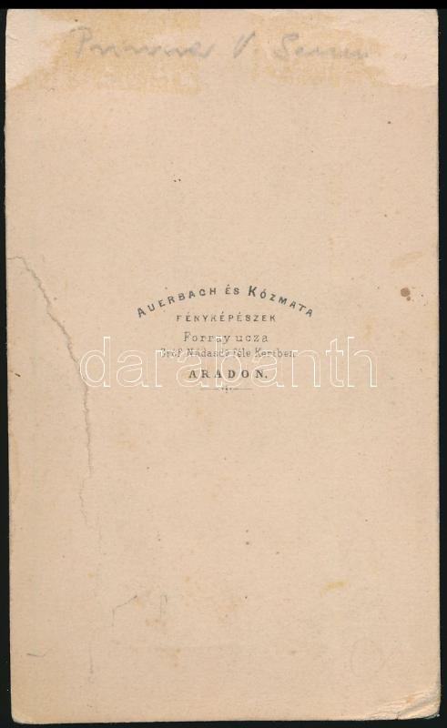 cca 1868 Arad, Auerbach és Kozmata fényképészek műtermében készült, vizitkártya méretű portréfotó, feliratozva, de nehezen olvasható, felületén törésvonal, 10,2x6 cm
