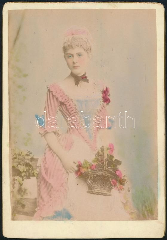 cca 1885 Marie von Vetsera (1871-1889) Vetsera Mária bárónő, Rudolf trónörökös (1858-1889) szeretője, a Mayerlingi tragédia másik áldozata, keményhátú fotó, kézzel színezett, 16x11 cm./ cca 1885 Marie von Vetsera (1871-1889), lover of Rudolf (1858-1889), crown prince of Austria, the other victim of Mayerling, boardphoto, hand coloured, 16x11 cm