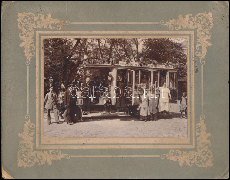 Beschreibung: cca 1900 Esztergom és Párkánynána között közlekedő járat virággal feldíszítve, kartonra kasírozott fotó, 12×17 cm