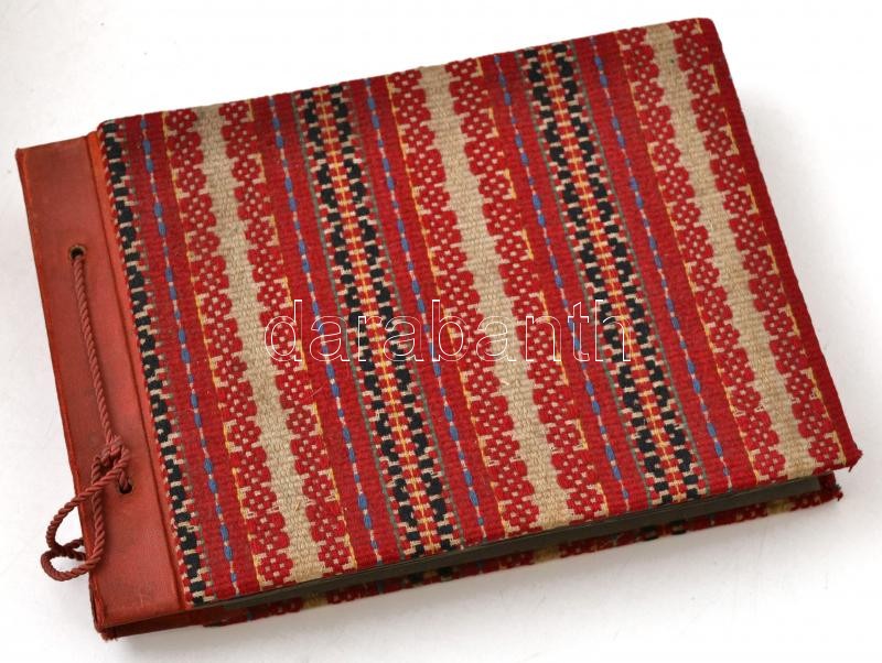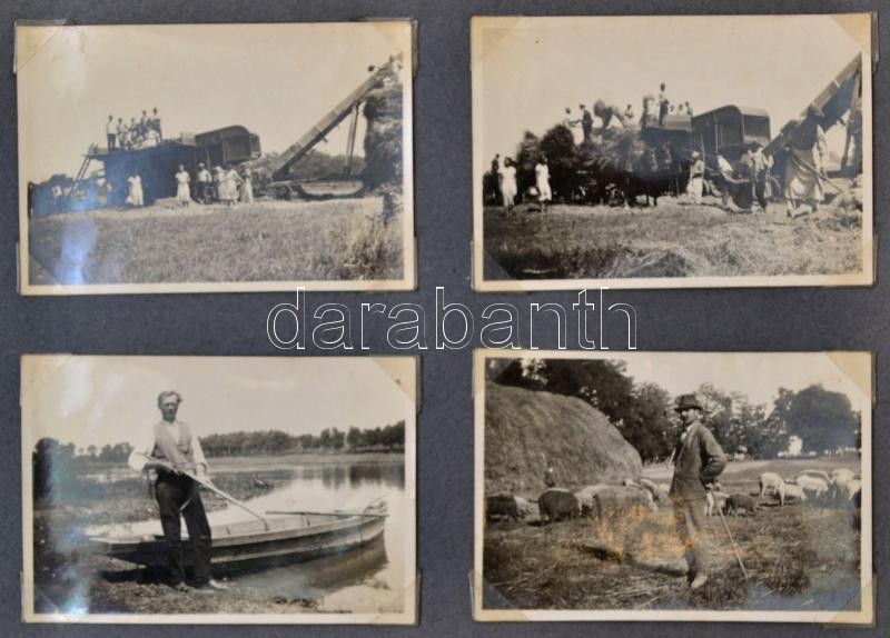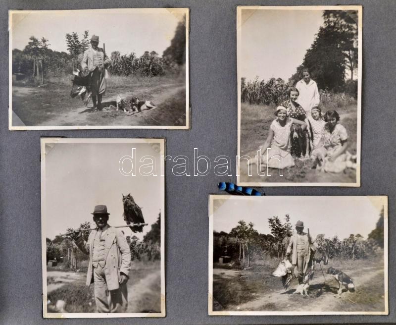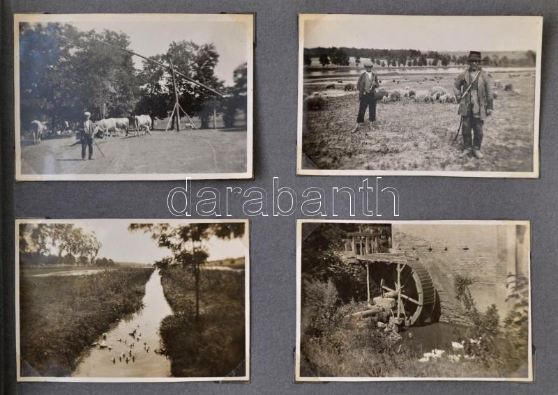 cca 1920-1930 Báró Kornfeld Móricné Weiss Marianne saját kézzel aláírt névjegyével ellátott családi fotóalbum, vidéki életképekkel (aratás, vadászat, fürdőzés, vízimalom, stb.), sok 6×8 cm-es fotóval