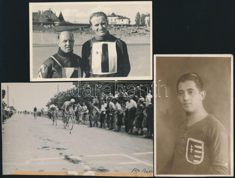 Beschreibung: cca 1925 Kerékpárverseny és versenyzők, 3 db vintage fotó, 14x9 cm és 10,5x17 cm