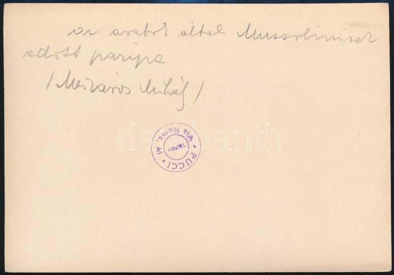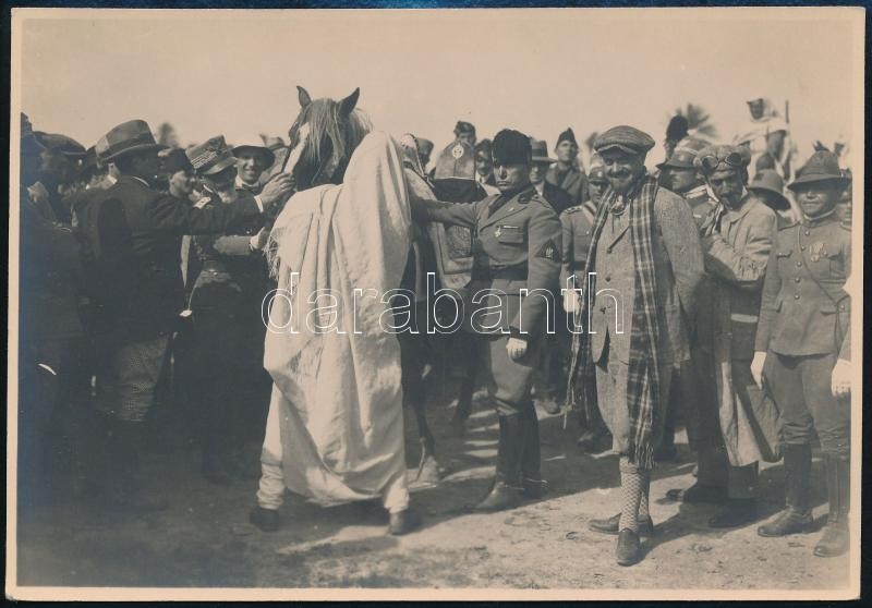 cca 1930 Az arabok paripát ajándékoznak Mussolininek Tripoliban, Pucci pecséttel jelzett fotója, hátoldalon feliratozva, 11,5×16,5 cm / Mussolini get a gift horse in Tripoli, photo with artist's stamp on the verso