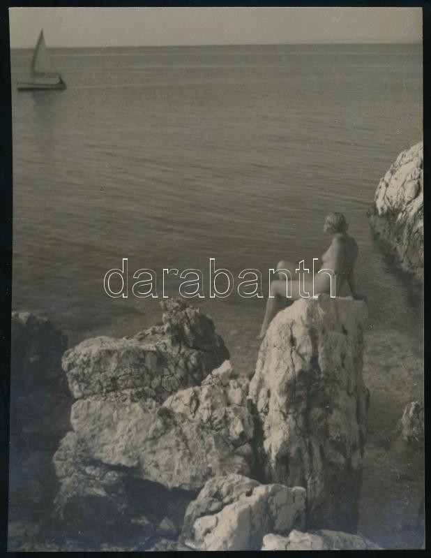 Beschreibung: cca 1930 Dr. Csörgeő Tibor (1896-1968): Sziklán napozó sellő, jelzés nélküli vintage fotóművészeti alkotás a szerző hagyatékából, 15x12 cm