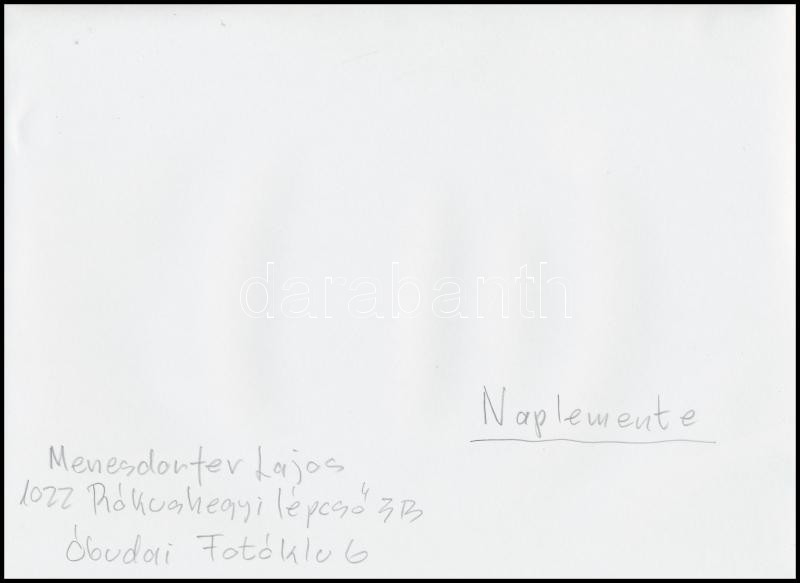 Beschreibung: cca 1979 Menesdorfer Lajos (1941-2005) budapesti fotóművész hagyatékából, feliratozott vintage fotóművészeti alkotás (Naplemente), 18x24 cm