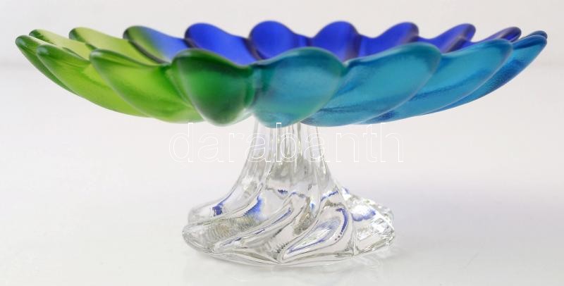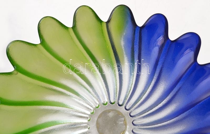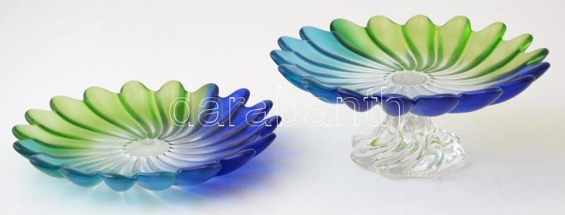 cca 1930 Walther Glass Liebenstern art deco kék-zöld talpas kínáló és tál (2db), jelzés nélkül, formába préselt, anyagában színezett, hibátlan, d: 20 cm, m:9 cm, d:20,5 cm / cca 1930 Walther Glass Liebenstern art déco blue.green Aufsatz and bowl (2 pieces), without hallmark, rolled glass, coloured, in flawless condition, d: 20 cm, h: 9 cm, d: 20,5 cm