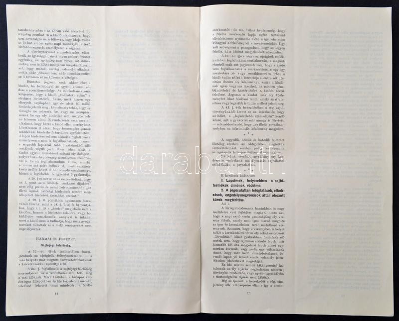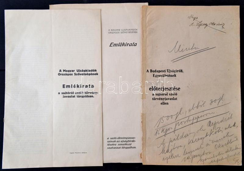 1913-1914 Budapesti Újságírók Egyesületének előterjesztése a sajtóról szóló törvényjavaslat ellen, (1913), ny.n., 31 p. Légrády Ottó (1878-1948) lapkiadó, újságíró, szerkesztő, 1913-tól Magyar Újságkiadók Országos Szövetség elnöke részére elküldött minta példány, a címlapon ceruzás bejegyzéssel, benne ceruzás bejelölésekkel, az utolsó lap szakadt, foltos, a gerincen szakadások.+ A Magyar Ujságkiadók Országos Szövetségének emlékirata a sajtóról szóló törvényjavaslat tárgyában. Bp., (1913) Légrády Testvérek-ny., 17 p. + A Magyar Ujságkiadók Országos Szövetségének emlékirata a sajtó-törvényjavaslatnak az újsághirdetésekre vonatkozó szakaszai tárgyában. Bp.,1914, Légrády-Testvérek, 6 p. Az 1913-ban sajtó törvény reformja heves vitákat és tiltakozásokat szült sajtó, és más szervezetek részéről.Erre vonatkozik a három "ellenjavaslat".