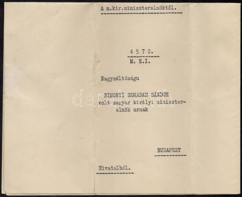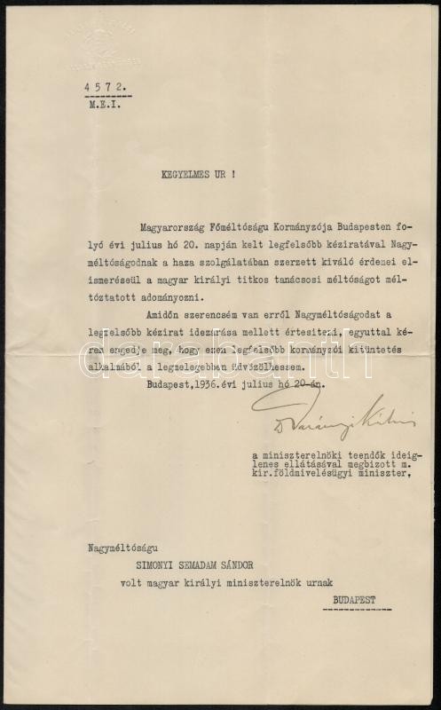 1936 Darányi Kálmán (1886-1939) földművelésügyi miniszter (1935-1938), későbbi miniszterelnök (1936-1938) gratuláló levele Simonyi-Semadam Sándor (1864-1946) korábbi miniszterelnöknek, ekkor a Magyar Jelzálog Hitelbank kormánybiztosának akit Horthy Miklós titkos aznap nevezett ki titkos tanácsossá. "Simonyi Semadam Sándor volt magyar királyi miniszterelnök urnak" címzéssel.