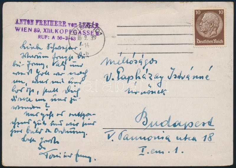 Beschreibung: 1939 Lehár Ferenc (1870-1948) zeneszerző saját kézzel megírt képeslapja vitéz Papházy Istvánnénak küldve.
