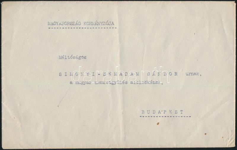 A kinevezés Horthy szárazpecsétes kormányzói levélpapÃrján.. "Méltóságos Simonyi-Semadam Sándor urnak a magyar nemzetgyűlés elnökének" cÃmzésű borÃtékkal.