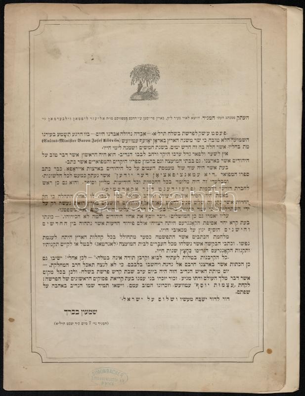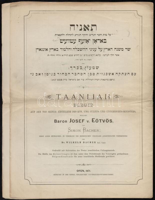 1871 Taanijah. Elegie auf den Tod Seiner Excellenz des Kön. Ung. Cultus- und Unterrichts-Minister wilad Baron Josef v. Eötvös von Simon Bacher. Ofen, 1871. - Gyászbeszéd Eötvos József halálára. 8p. 34 cm