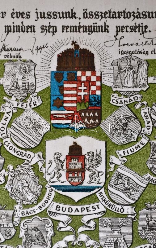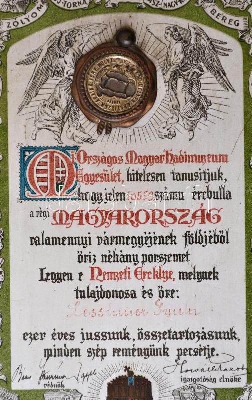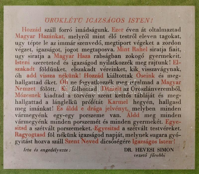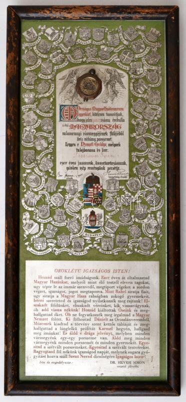 1922 Országos Magyar Hadimúzeum Egyesület Nemzeti Ereklye sorszámozott, névre szóló. Nagy-Magyarország valamennyi vármegyéjének földjéből származó földet tartalmazó emlék. Ércbulla. Az elszakított részek címereit bemutató festett alumíniumlap. Dr. Hevesi Simon vezető főrabbi Öröklétű Igazságos Isten! című imájával.. Jó állapotban. / 1922 Memorial for the divided Hungary. With the reccomendation of the leading rabbiah of Hungary. Numbered, for a person's name. In frame. 14x32 cm