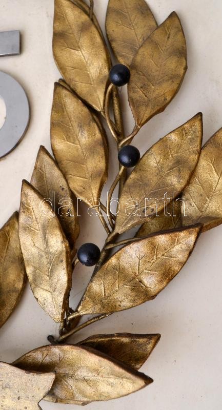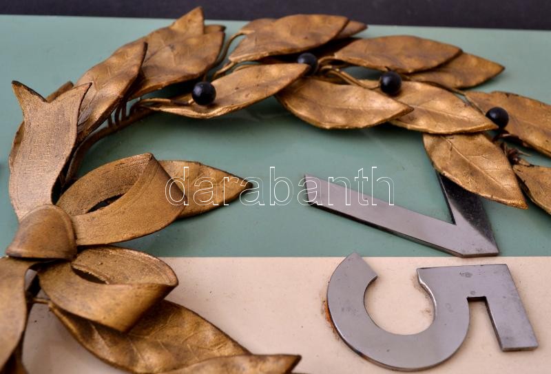 Beschreibung: 1974 Az FTC Klub alapításának 75. évfordulójára készített falra akasztható emléktábla babérkoszorúval, fém és műanyag elemekből, 32×24 cm