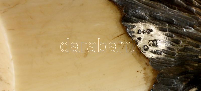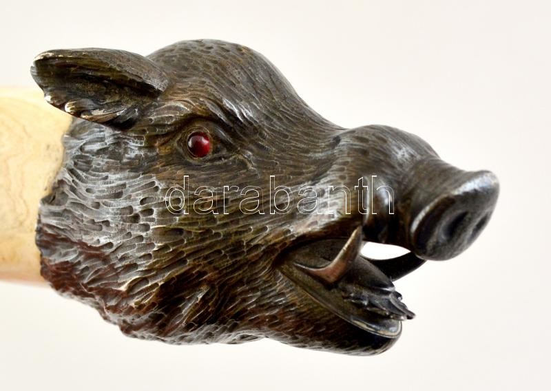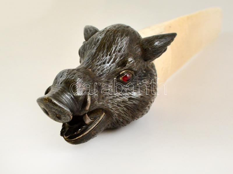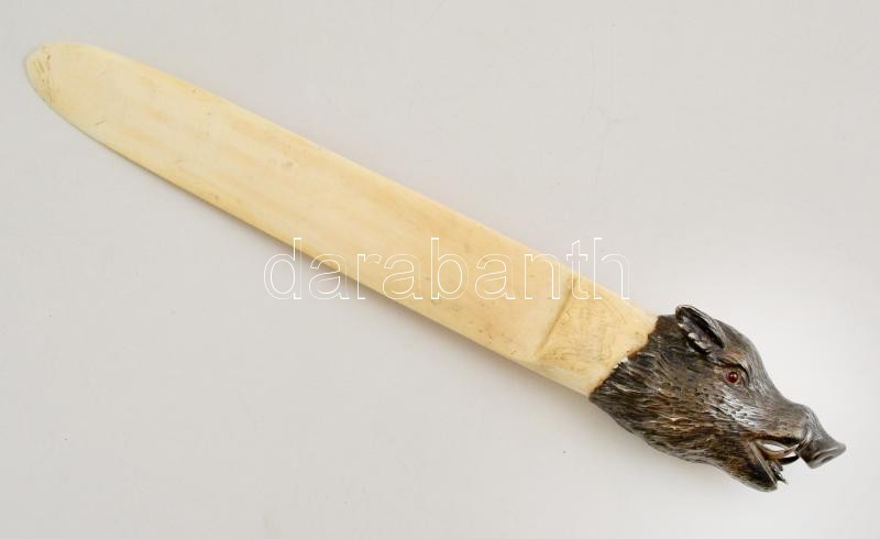 cca 1900 Nagyméretű díszes elefántcsont levélbontó, szintetikus rubin berakásos, vaddisznófej alakú ezüst (Ag.) markolattal, jelzett, mesterjeggyel (Georg Adam Scheid), a széleken kis lepattanásokkal, h: 44 cm, bruttó 470 g / cca 1900 Huge ivory letter opener with silver (Ag.) hilt in the form of a boar's head with synthetic ruby inlays, hallmarked (Georg Adam Scheid), with minor signs of use along the edge, l: 44 cm, net weight: 470 g