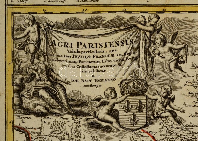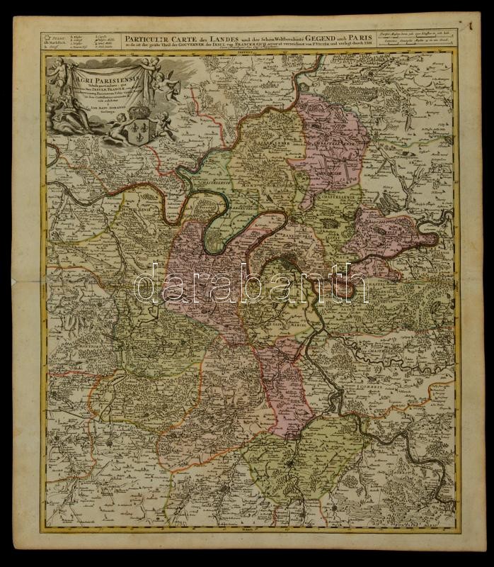 1720 Párizs és környékének térképe. Johann Baptist Homann: Agri Parisiensis Tabula particularis, qua maxima Pars Insulae Franciae . Particulir Carte des Landes und der Schön-Weltberuhmte(n) Gegend umb Paris. Színezett rézmetszet / Map of Paris and neighbouring areas Colored copper plate engraving 62x55 cm