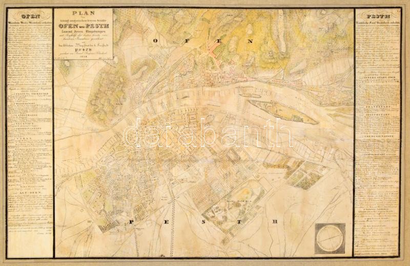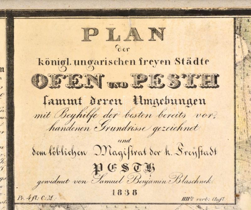 1838 Blaschnek Samuel Benjámin (1789-1854): Plan der königl. ungarischen freyen Städte Ofen und Pesth sammt derren Umgebungen. Statisztikai táblákkal és magyarázatokkal. Részletes térkép sarokház-számozással, a főbb épületek alaprajzával, hajózási és vízrajzi adatokkal, Buda és Pest statisztikai adataival. Kartonra kasírozott, paszpartuban, restaurált. 89x60 cm