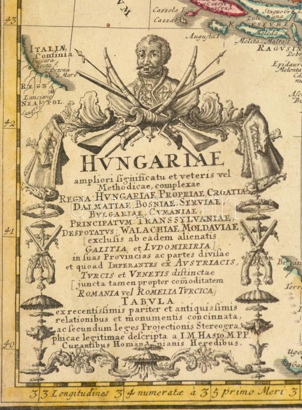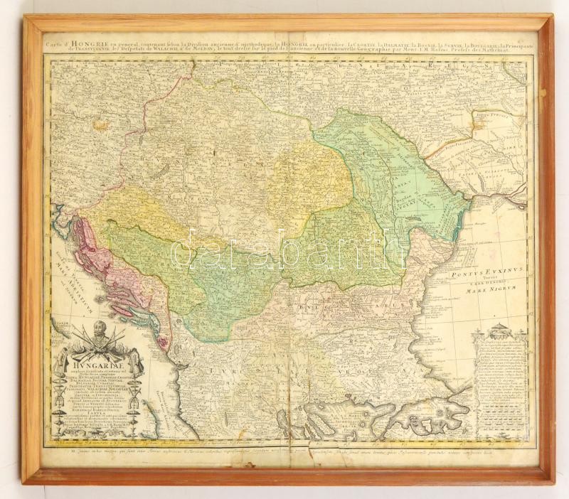 Carte d'Hongrie en general, contenant selon la division ancienne & Methodique, la Hongrie en particuliee, la Croatie, la Dalmatie, la Bosnie, la Boulgrie, la Principaute de Transylvanie, les Despotats de Walachie & de Moldaviae... par. M. Hasius. 1744. Színezett rézmetszet, a szövegben utalás a pozsareváci és a belgrádi békére. Szakadással. Üvegezett keretben. / Colored copper engraving. Map of Hungary and the neighboring areas 58x49 cm