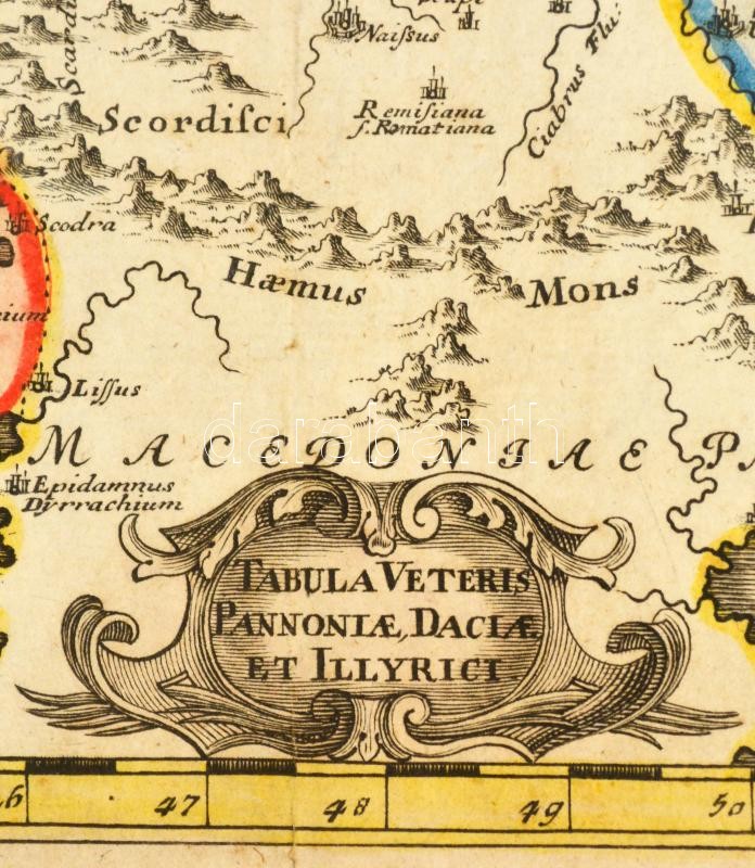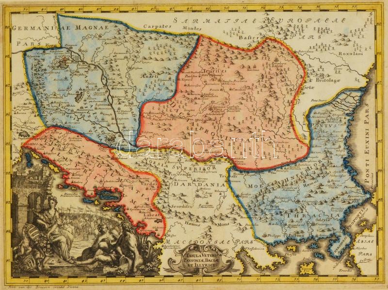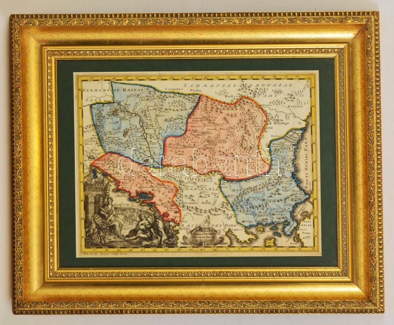 cca 1690 Joannes van der Brugghen (1649-1714 k.): Tabula veteris Pannoniae, Daciae et Illyrici, térkép, színezett rézmetszet, papír, paszpartuban, plexizett díszes fa keretben, 25×34 cm / cca 1690 Joannes van der Brugghen (1649-cca 1714): Tabula veteris Pannoniae, Daciae et Illyrici, map, coloured copper etching, on paper in passe-partout and wooden frame, 25×34 cm