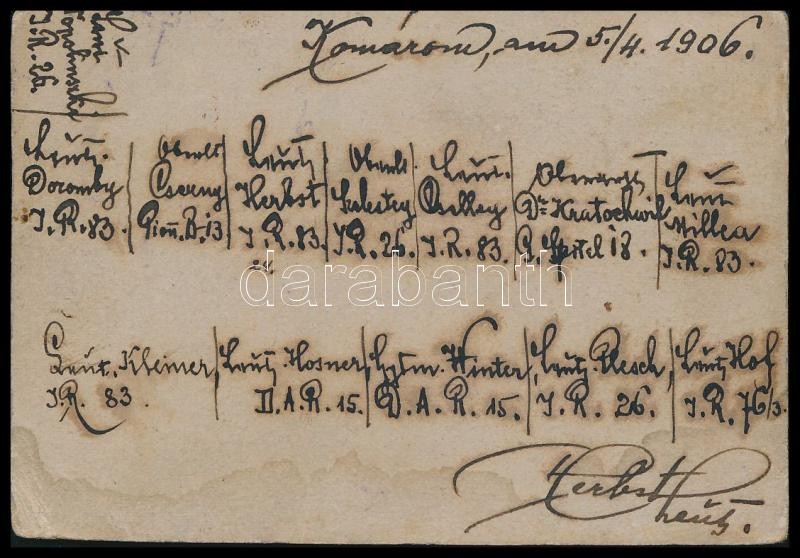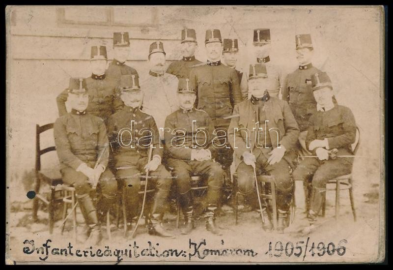 1906 Komárom, vitéz Doromby József (1881-1972) alezredes, katonai szakíró, Komáromban, tiszttársai körében, a hátoldalon feliratozva, rajta a tisztek neveivel , és alakulat számokkal, kartonált fotó, 6x9 cm.