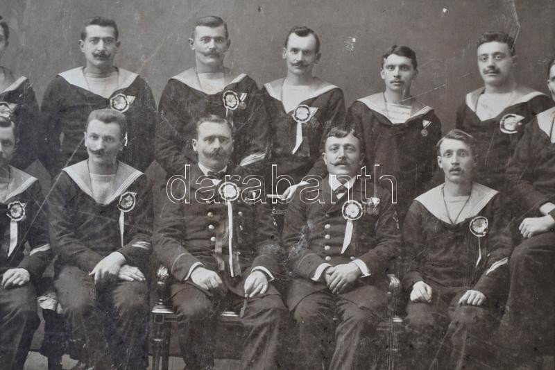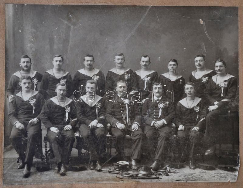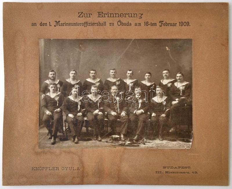 1909 Óbudai hadtengerész bál emlékére, 1909. február 16, az első sorban két tiszttel, kitüntetésekkel, nagyméretű fotó kartonon. Bp., Knöpfler Gyula, a karton hullámos, foltos, a fotó felületén kopásnyomokkal, az egyik sarkánál és a felületén sérüléssel, 20x27 cm/ 1909 Zur Erinnerung an den Marineunteroffiziersball zu Óbuda am 16-ten Februrar 1909., Óbuda, Memory of marinerball, 1909., photo on board, Bp., Knöpfler Gyula, the board spotty, the photo worn, a damaged, 20x27 cm.