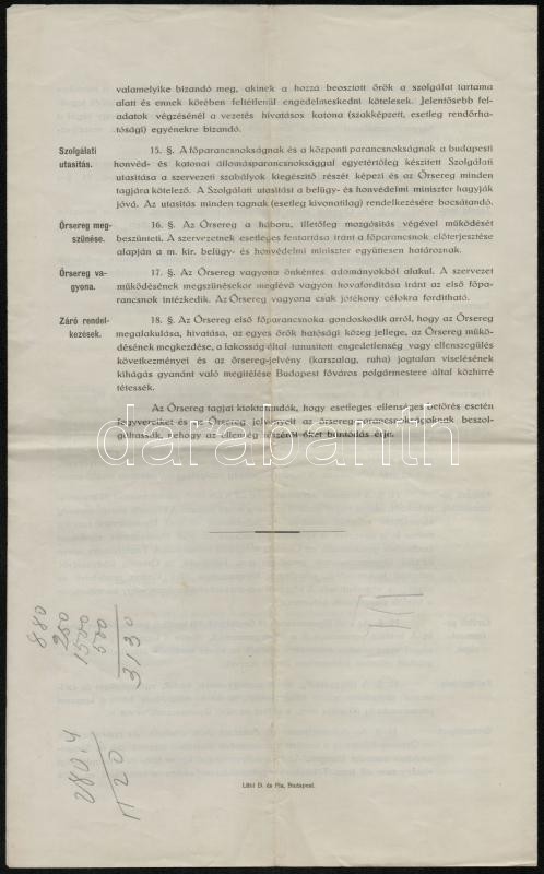 Beschreibung: 1914 Budapesti Önkéntes Őrsereg szevezeti szabályai. Bp., Löhl D. és Fia, az utolsó oldalon ceruzás jegyzettel, 4 p.