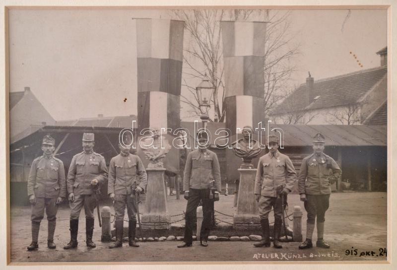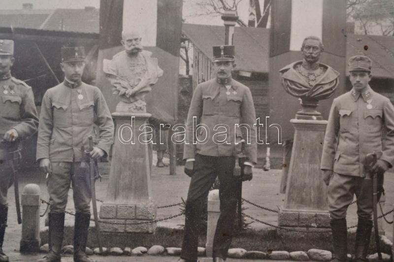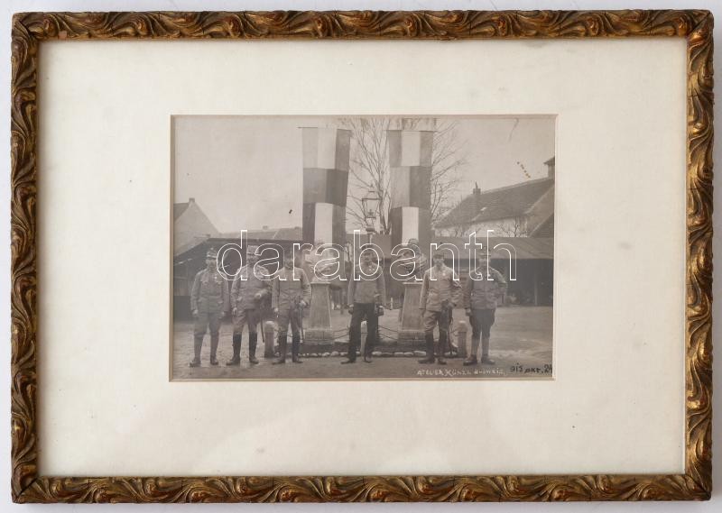 1915 Budweis, osztrák-magyar katonák Ferenc József és Vilmos császár szobrával. Fotó üvegezett keretben. Keret mérete 26x18 cm / Budweis, Austro-Hungarian soldiers with the statues of Franz Joseph and Emperor Wilhelm. In glazed frame.
