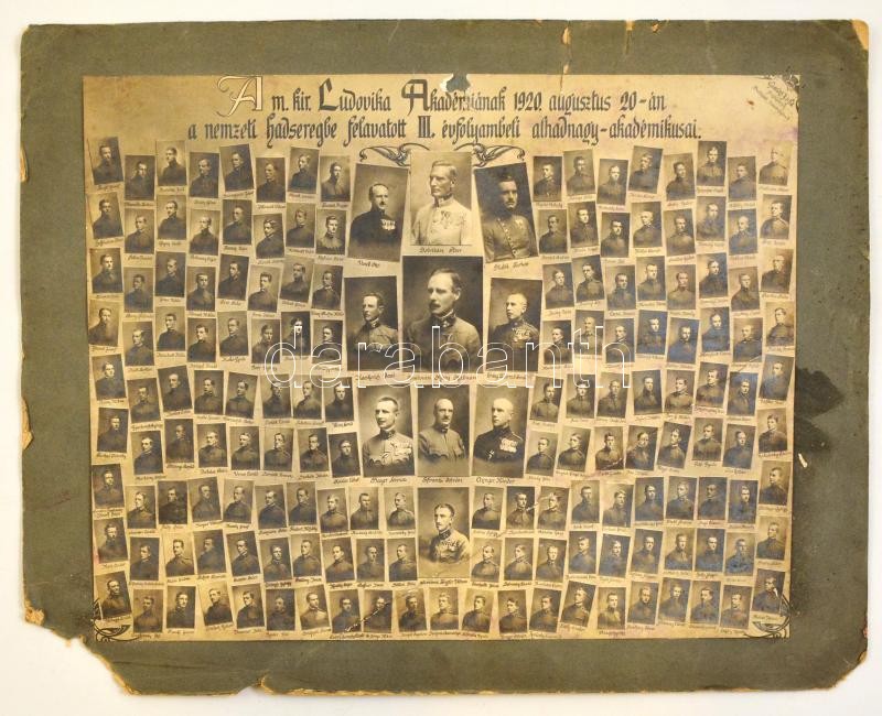 1920 A m. kir. Ludovika Akadémiának 1920. augusztus 20-án a nemzeti hadseregbe felavatott III. évfolyambeli alhadnagy-akadémikusai, tablókép, Goszleth J. és fia, Budapest, kartonra ragasztva, sérült, 33×41,5 cm