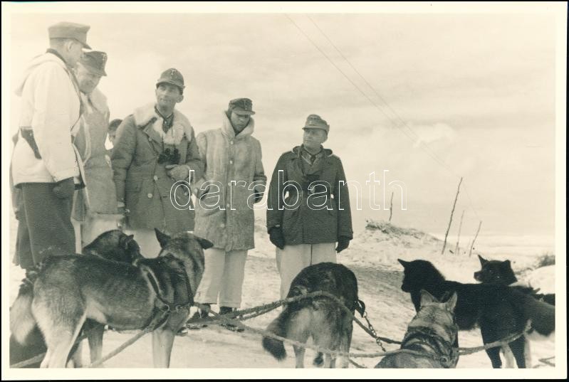 Alfred Jodl (1890-1946) a Wehrmacht vezérkari főnöke és Eduard Dietl (1890-1944) német tüzérségi tábornok Finnországban, kutyás szánnal, fotó, hátoldalán pecséttel jelezve, 11,5x17,5 cm Alfred Jodl hagyatékából / General Jodl and General Dietl in Finland, photo. From the legacy of Alfred Jodl 11,5x17,5 cm