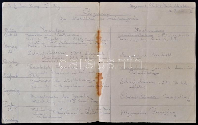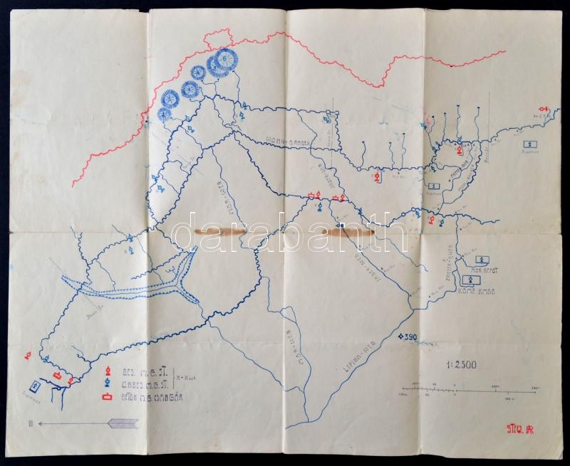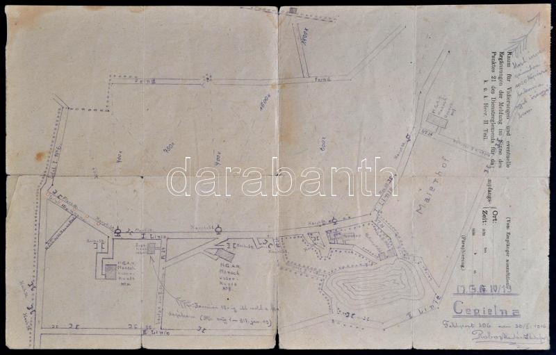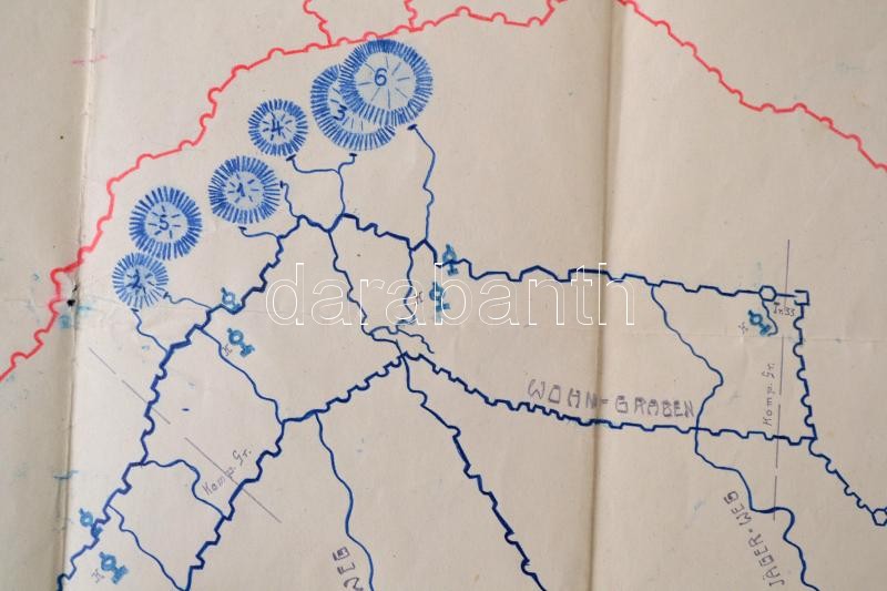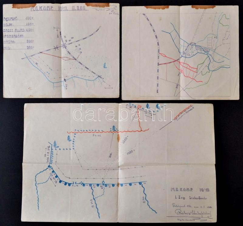Roboz Aladár (1895-1986) zsidó származású filmvállalati- és színházigazgató, Roboz Imre (1892-1945) lapszerkesztő, színházigazgató öccsének I. világháborús térképtáskája, benne 5 db kézzel rajzolt első világháborús térképpel, 17x21 cm és 33x41 cm közötti méretben, valamint 1 db kézzel írt jegyzettel, változó állapotban, kopott táskával