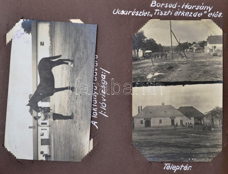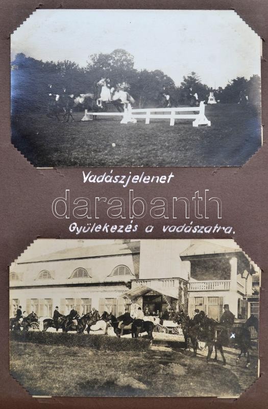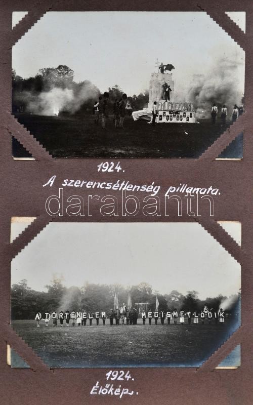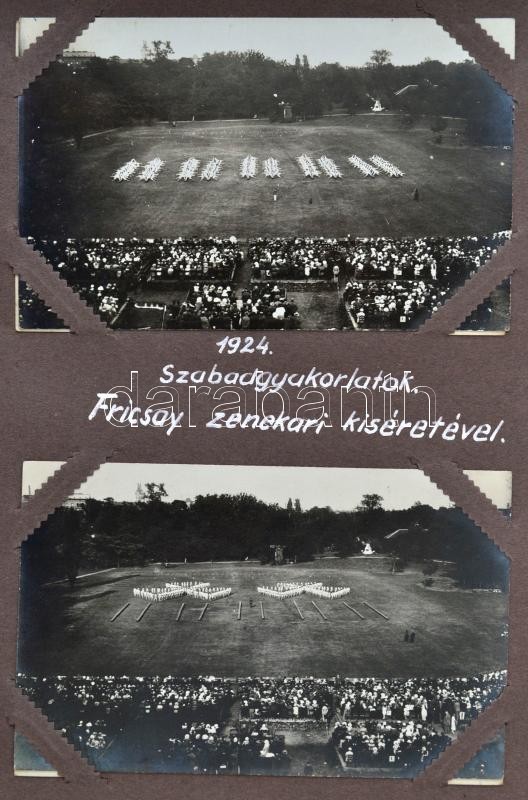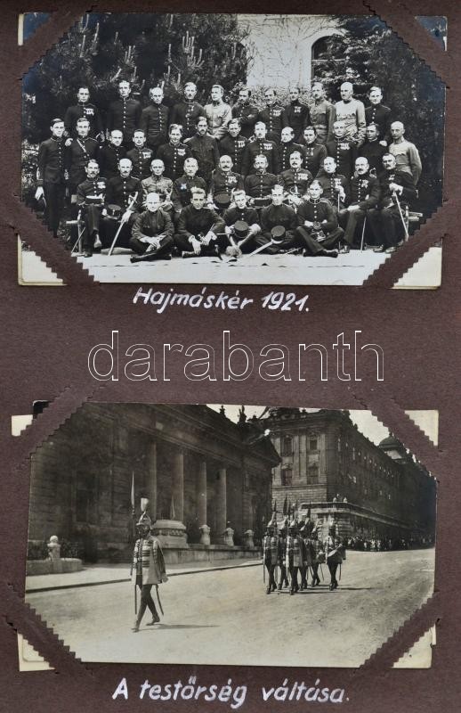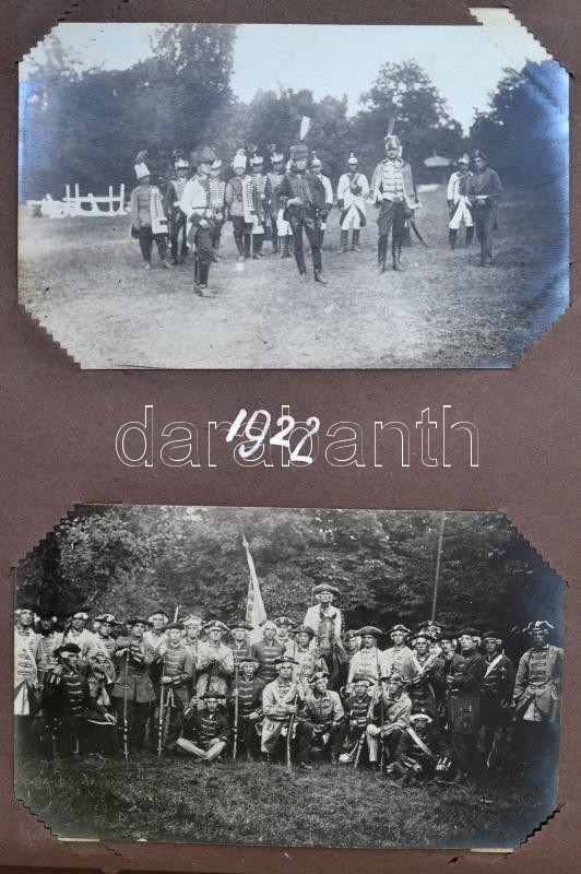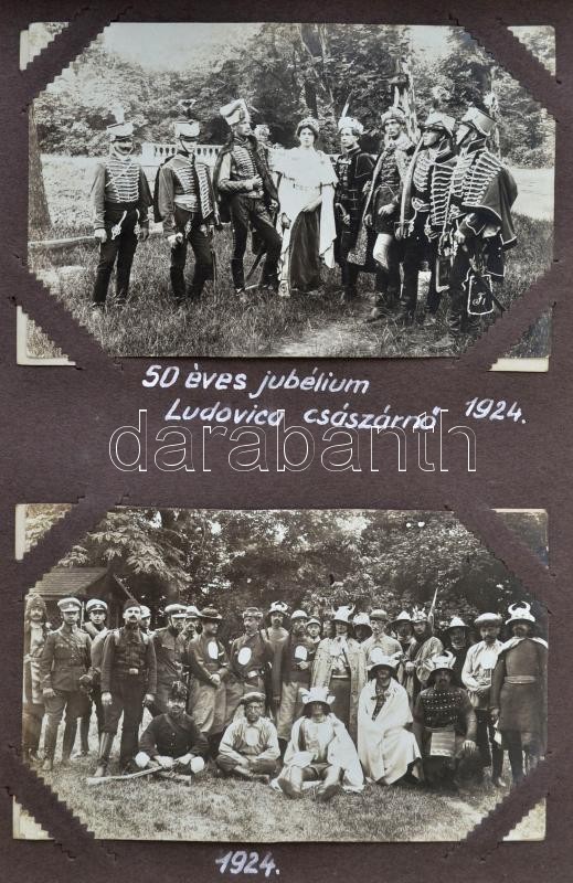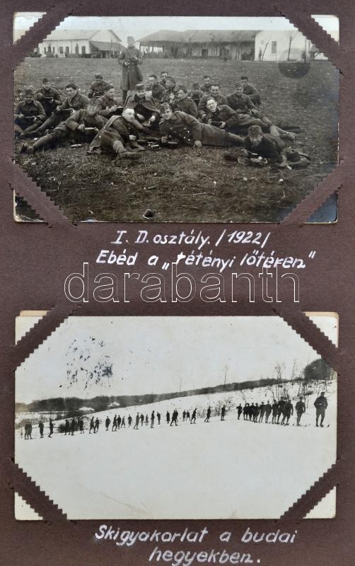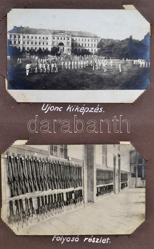 cca 1921-1925 A Magyar Királyi Honvéd Ludovika Akadémiát és a kadétok életét bemutató páratlan fotóalbum. 111 db látványos, képeslap méretű fotó magyarázó feliratokkal a katonai akadémia mindennapjaiból. Az épületek bemutatása mellett főleg mozgalmas képek. Felvonulások, megemlékezések, gyakorlatok, hadi játékok, lóvizsgálat, külső helyszínek a jó minőségű képeken, / cca 1921-1925 Collection of 111 interesting and quality photos of the Ludovica Military Academy. The life of the inmates on real photo postcards.