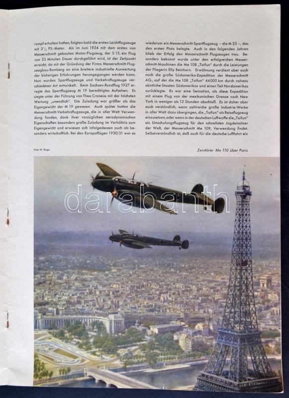 cca 1940 Messerschmitt - Jäger und Zerstörer. Vadászgépeket bemutató, nagyméretű, színes reklámkiadvány. Dombornyomott borítóval, rajta kis beszakadás. 8p. Folio / ca 1941 Messerschmitt military planes picture booklet, advertising. Wirh small tear in. 25x35 cm