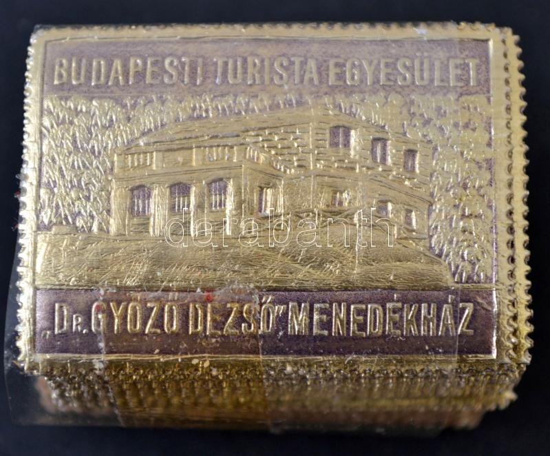 Beschreibung: 1938 Budapesti Turista Egyesület Dr. György Desző menedékház. dombornyomott levélzáró bündli. Lila, arany papíron. 100 db