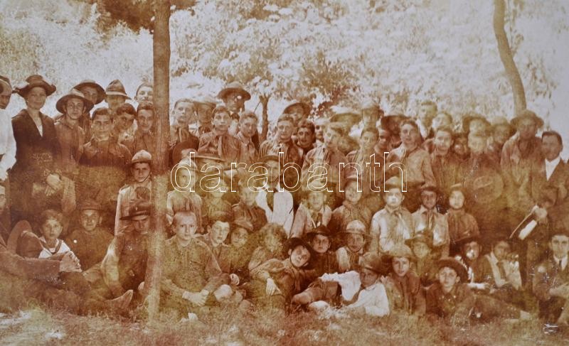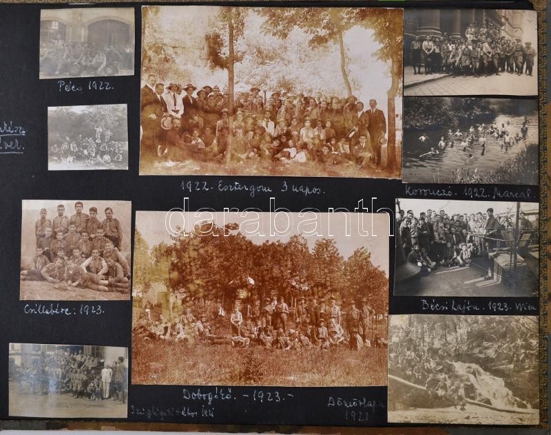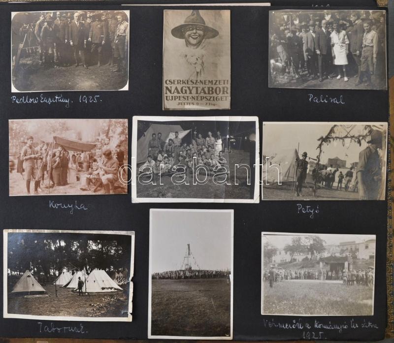 1922-1933 Cserkész fotóalbum sok fotóval,, köztük az 1933-as Jamboree-n készült felvételekkel, 153 db különböző méretű fotó, albumba ragasztva / Scout album with 153 photos