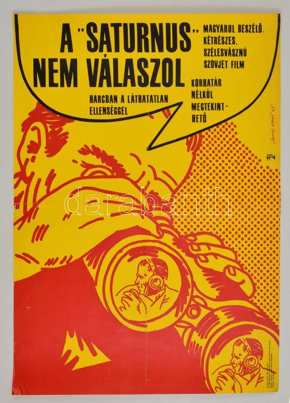1968 Darvas Árpád (1927 - ): A "Saturnus" nem válaszol Harcban a láthatatlan ellenséggel, szovjet film plakát, hajtásnyommal, 56x40 cm / Soviet film poster, folded, 56x40 cm