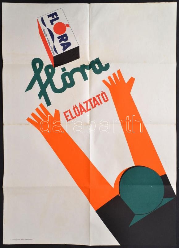 Beschreibung: cca 1960 Berény Róbert (1887-1953) - Gaál Mátyás (1909-?): Flóra előáztató reklám plakát, hajtott, 83x59 cm