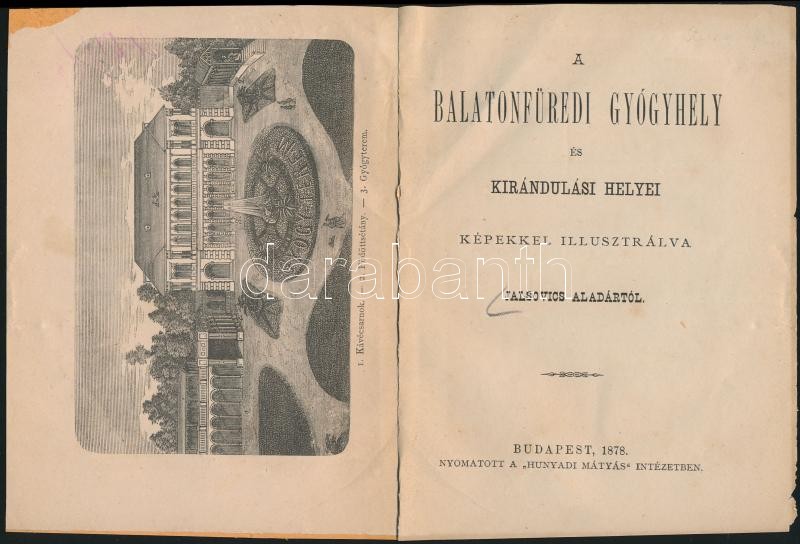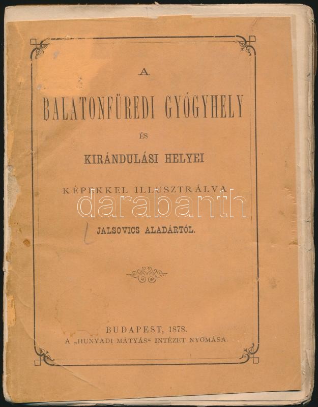 Jalsovics Aladár: A balatonfüredi gyógyhely és kirándulási helyei. Bp., 1878, Hunyadi Mátyás Intézet. Foltos, elváló gerincű papírkötésben, térképmelléklettel.