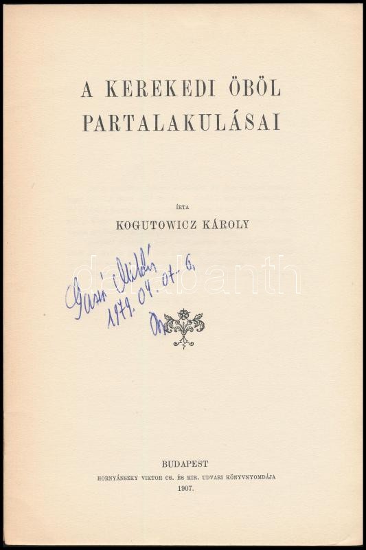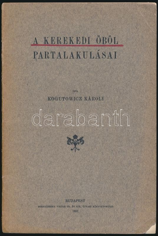 Kogutowicz Károly: A kerekedi öböl partalakulásai. Bp.,1907, Hornyánszky Viktor-ny., 24 p.+III t.+1 térkép melléklet. Kiadói papírkötés, a borítón aláhúzással, az egyik sarkánál kis hiánnyal, a gerincen szakadással.