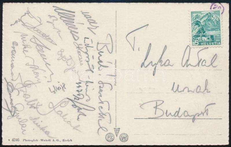 1947 A Ferencváros (Fradi) labdarúgócsapata tagjainak aláírásai Kocsis, Kéry, Mike, Gyulai, Szabó, Hegyes , Lyka és mások / Autograph signed postcard by the Ferencvaros football team