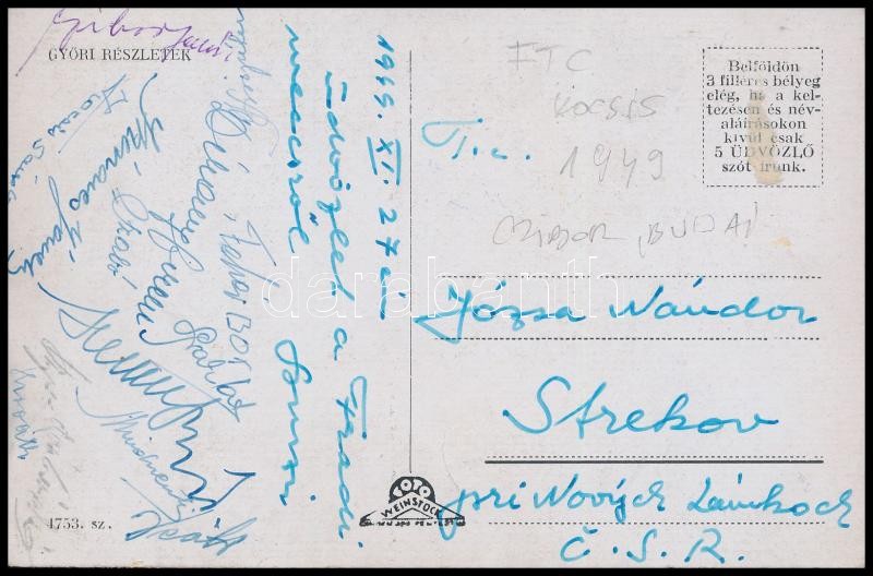 Beschreibung: 1949 A Fradi (FTC, Ferencváros) játékosainak (Czibor, Fehér, Szabó, Kocsi Sándor, stb.) aláírásai levelezőlapon