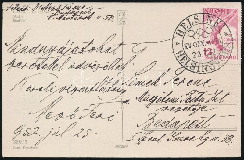 1952 Olimpiáról hazaküldött képeslap Mező Ferenc (1885-1961) olimpia bajnok saját kezű soraival / Postcard with autograph message of Hungarian olimpic champion
